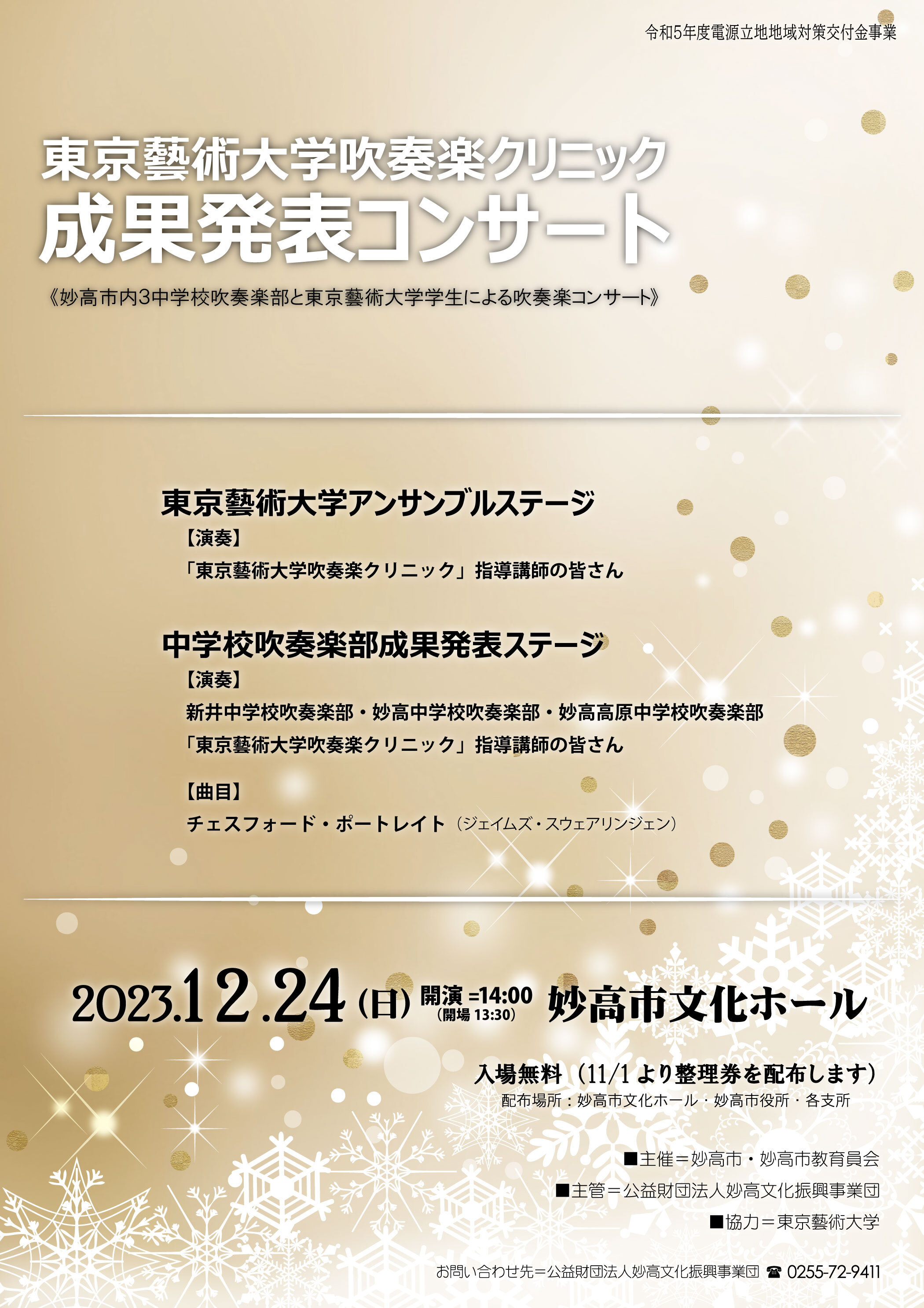 - 東京藝術大学吹奏楽クリニック成果発表コンサート 妙高市文化ホール 14時開演 *東京藝大の学生と、学生から指導を受けた妙高市内3中学校吹奏楽部による演奏 入場無料 会場や妙高市役所で整理券配布中 公式サイト ちらし