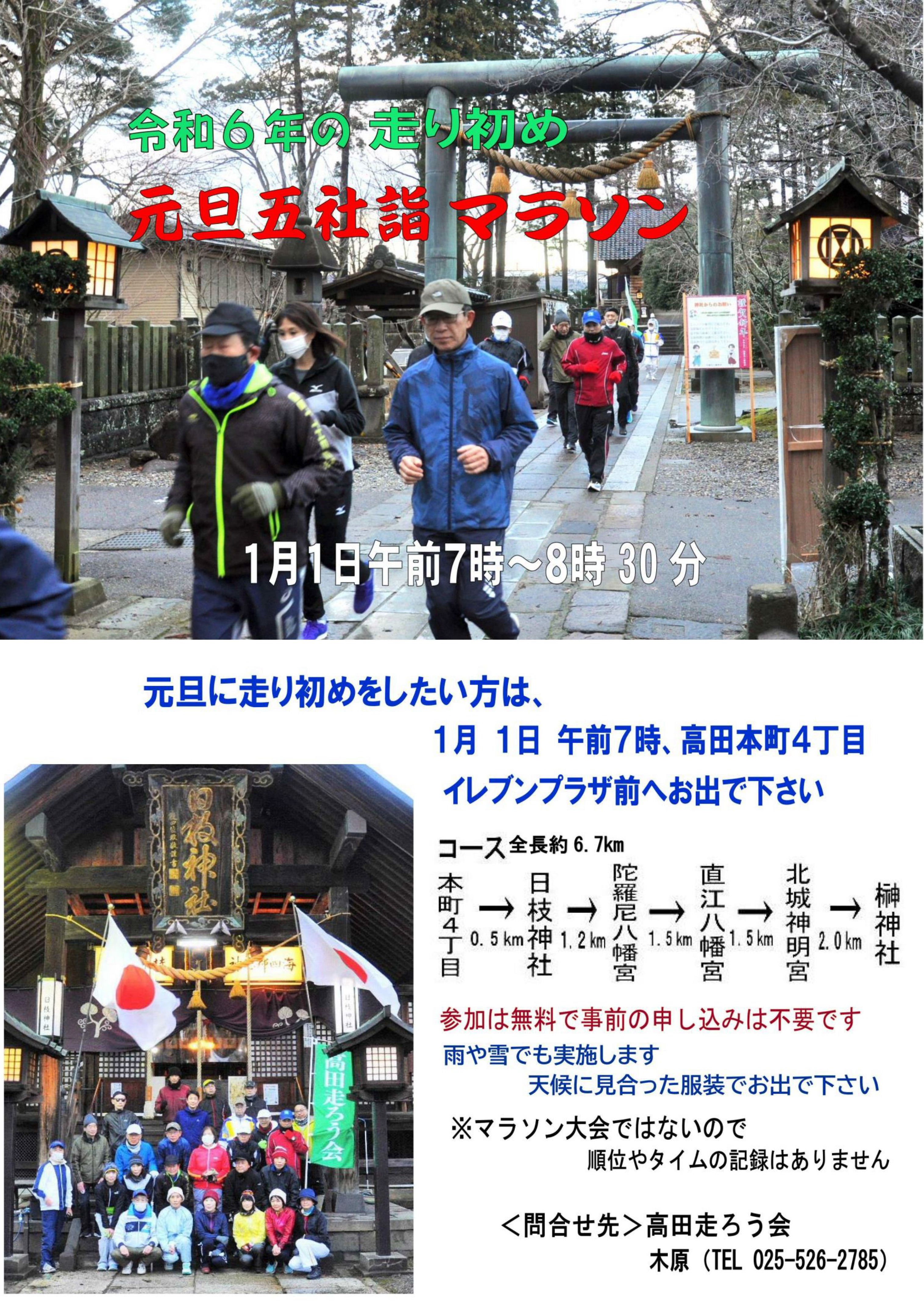 - 元旦五社マラソン 7時イレブンプラザ(本町4)集合 *高田走ろう会主催 日枝神社、陀羅尼八幡宮、直江八幡宮、北城神明宮、榊神社を巡る ちらし ホームページ