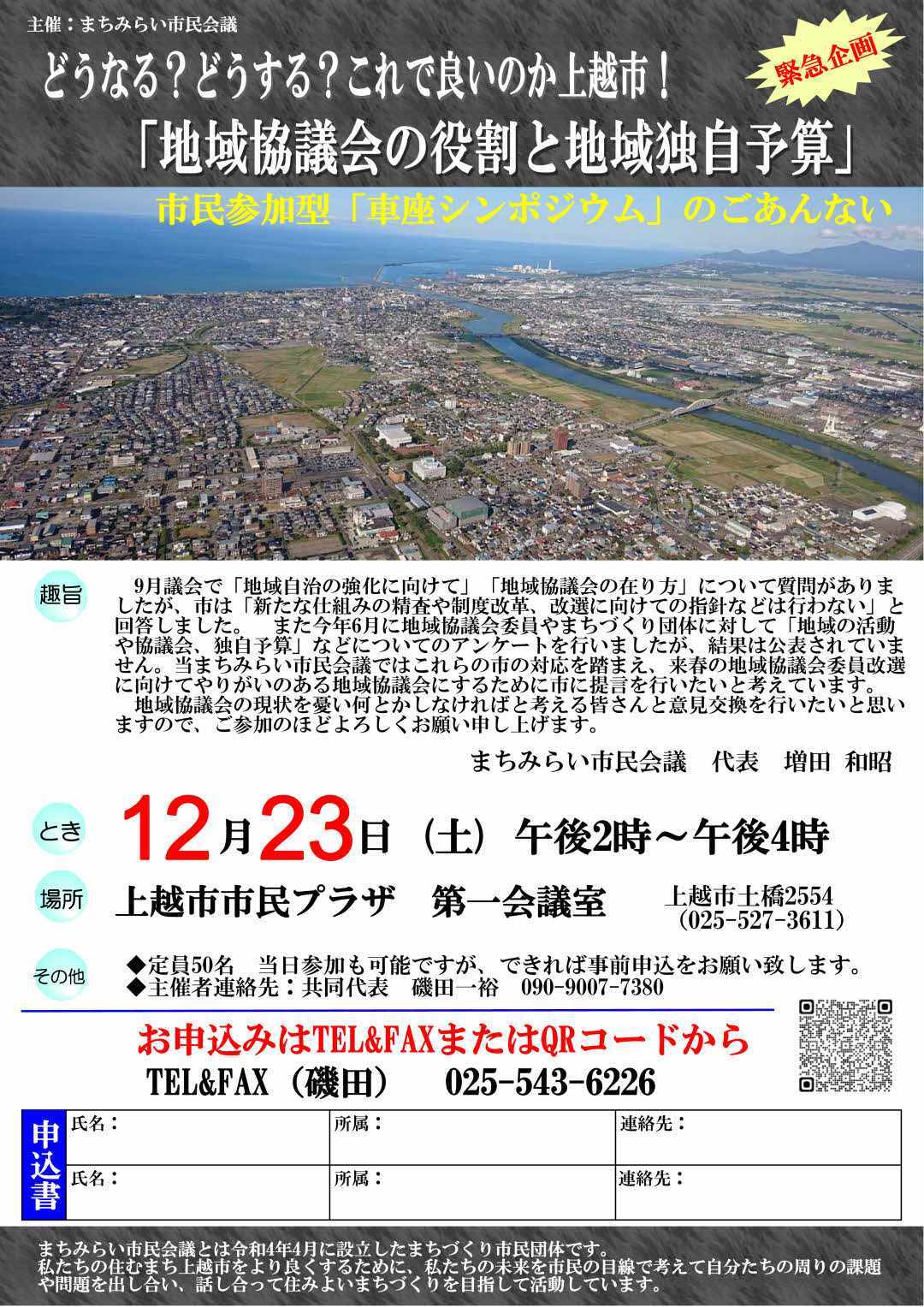 - どうなる?どうする?これで良いのか上越市!「地域協議会の役割と地域独自予算」 上越市市民プラザ(土橋) 14時〜16時 *まちみらい市民会議主催の市民参加型車座シンポジウム 申し込みフォーム(当日参加も可) ちらし