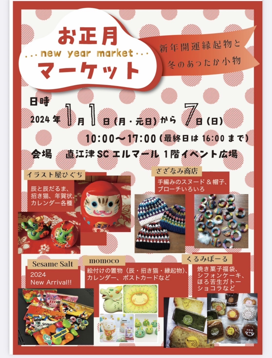 - お正月マーケット エルマール1階イベント広場 10時〜17時(最終日は16時まで) 〜7日 *新年開運縁起物や小物など販売 ちらし