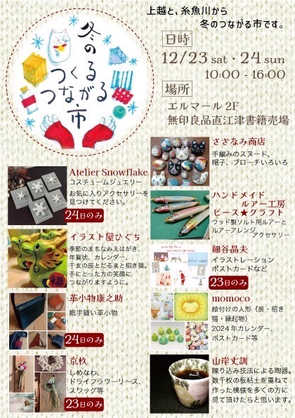 - 冬のつくるつながる市 無印良品直江津書籍売り場 10時〜16時 〜24日 *冬の小物や縁起物など販売 ちらし 公式サイト