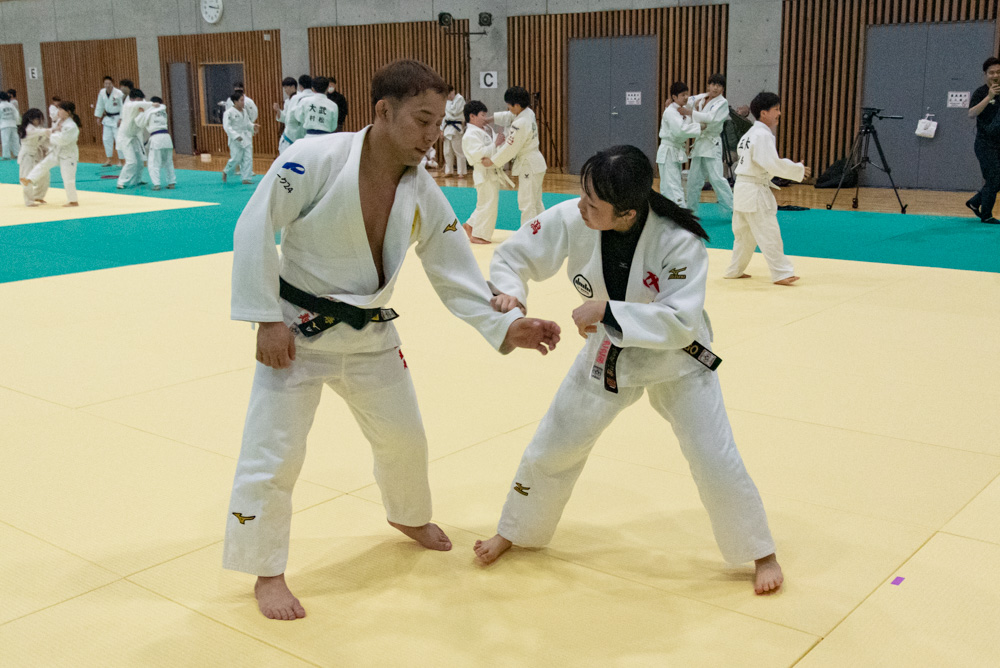 高藤選手と乱取りをした上越市立中郷中3年の女子生徒(15)は「体がごつくてパワーもスピードもすごかった。組んだ後の動きが早く、同じ軽量級として見習いたい」と話した。石川県志賀町から参加した小学3年の女子児童(9)は、能登半島地震で通っていた道場が使えなくなったという。「道場が地震でつぶれてから、ほかの道場で少ない人数で練習していたので、こんなに大人数で広い場所で練習できて、すごくいい経験になった」と話していた。
