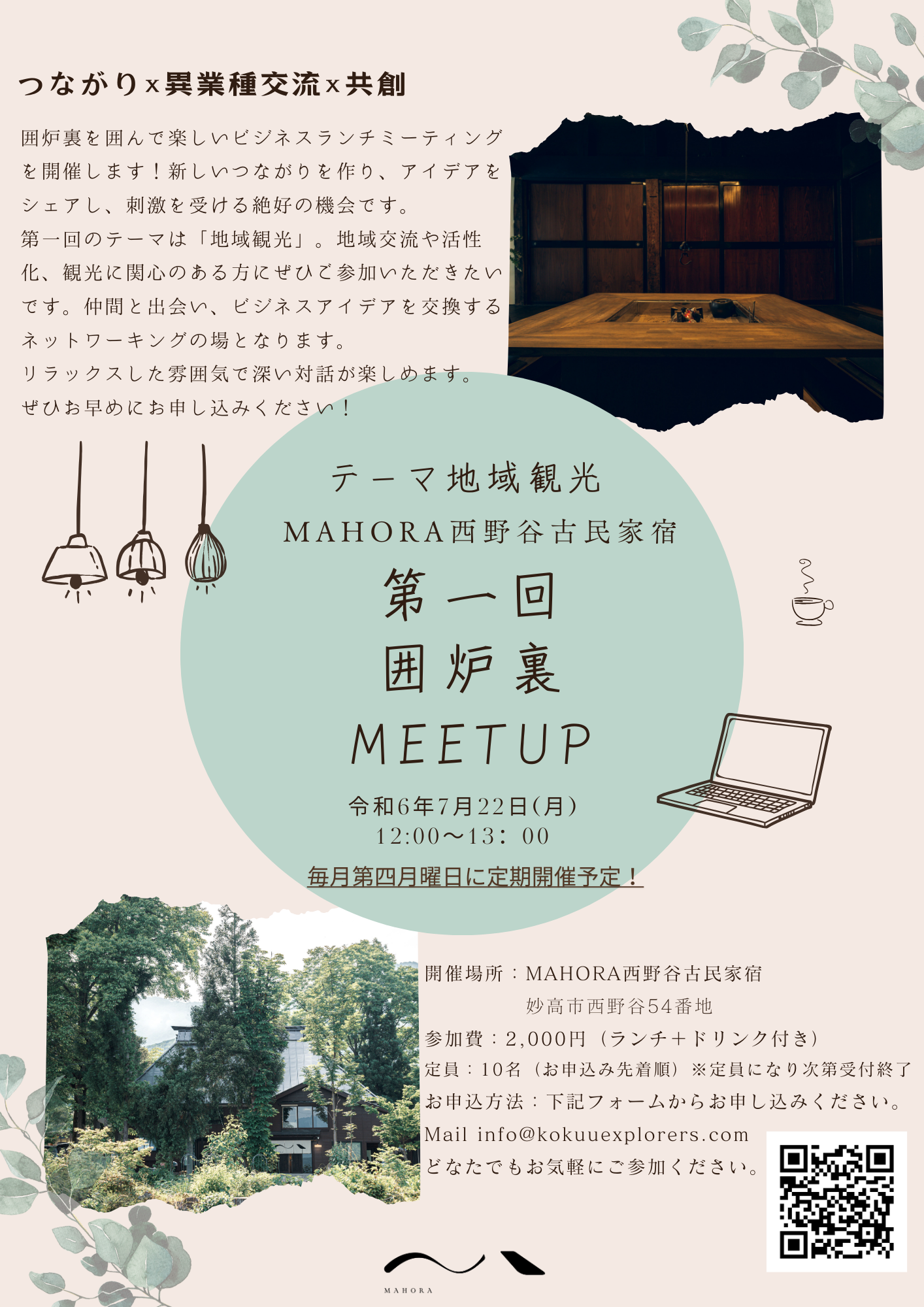 - 囲炉裏MEET UP 古民家宿MAHORA西野谷 12時〜13時(毎月第4月曜開催予定) *異業種交流、つながり作りの場 参加費2000円(ランチ+ドリンク付き) 定員10人 申し込みはこちら ちらし