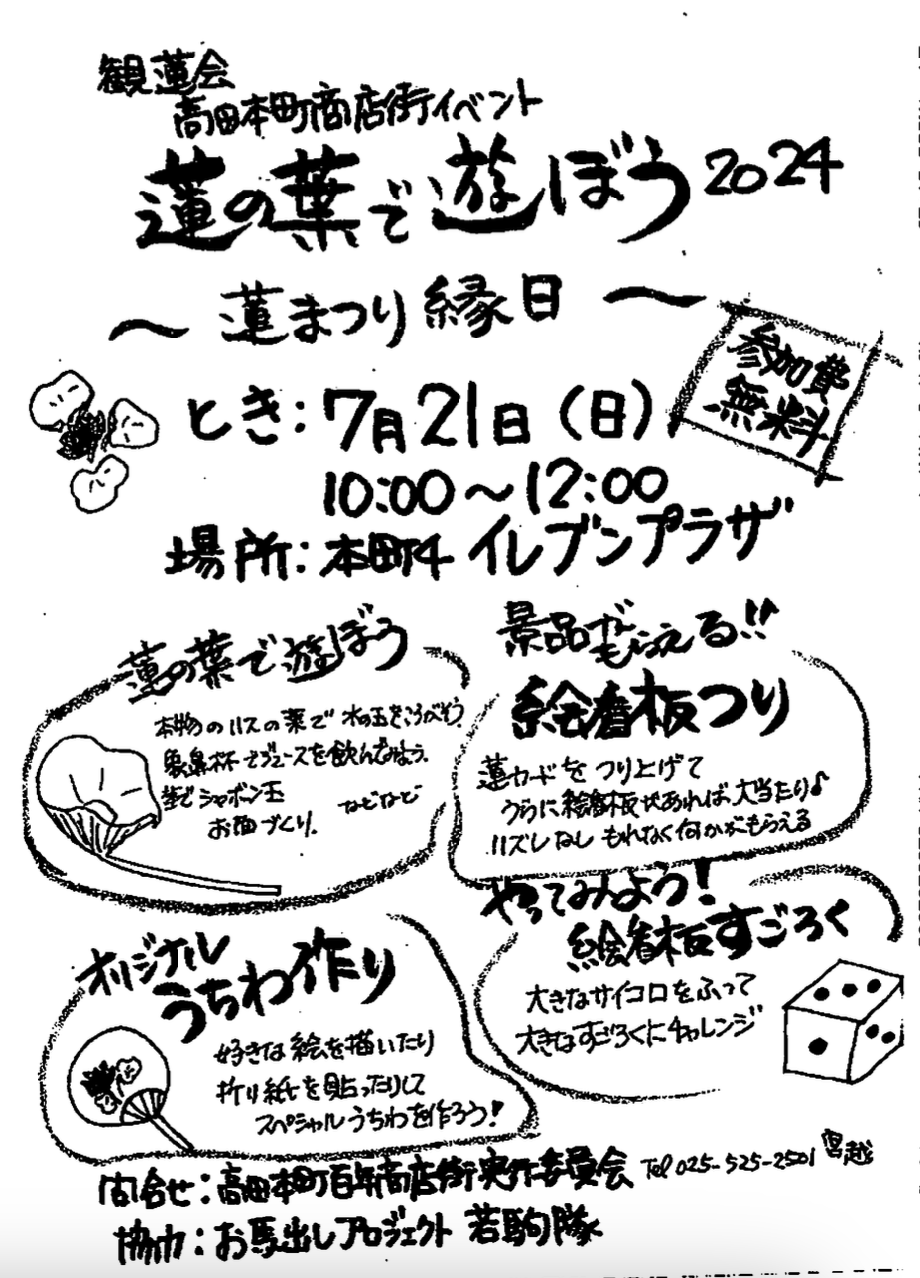 - 蓮の葉で遊ぼう2024〜蓮まつり縁日〜 イレブンプラザ(本町4) *ハスの葉のお面づくり、オリジナルうちわ作り、絵看板すごろくなど ちらし