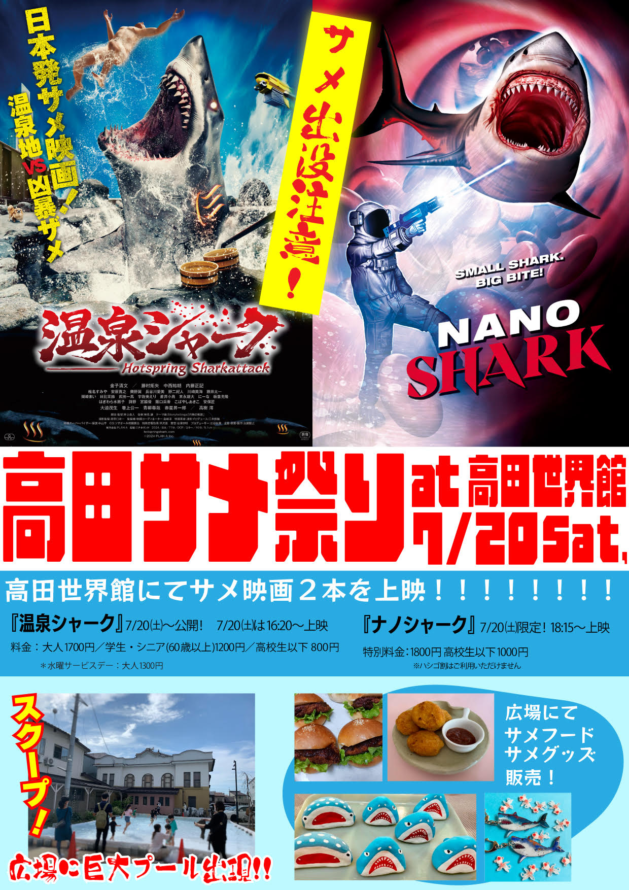 - 高田サメ祭り 高田世界館 サメにまつわる映画上映①「温泉シャーク」16時20分〜、②「ナノシャーク」18時15分〜 サメフード、グッズ販売、水遊び用プールも ちらし 公式サイト