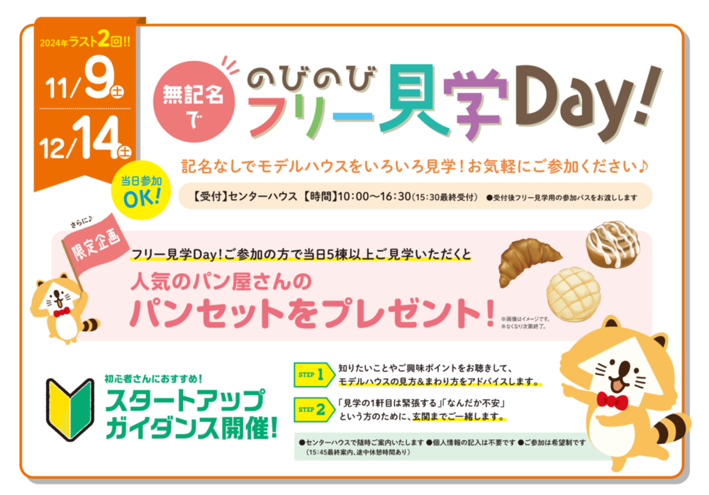 5社以上の見学で人気ベーカリーのパンをプレゼント。後日商談(次回予約をしてプランや見積もりの作成など)でJCBギフト券1万円分プレゼントの特典もある。