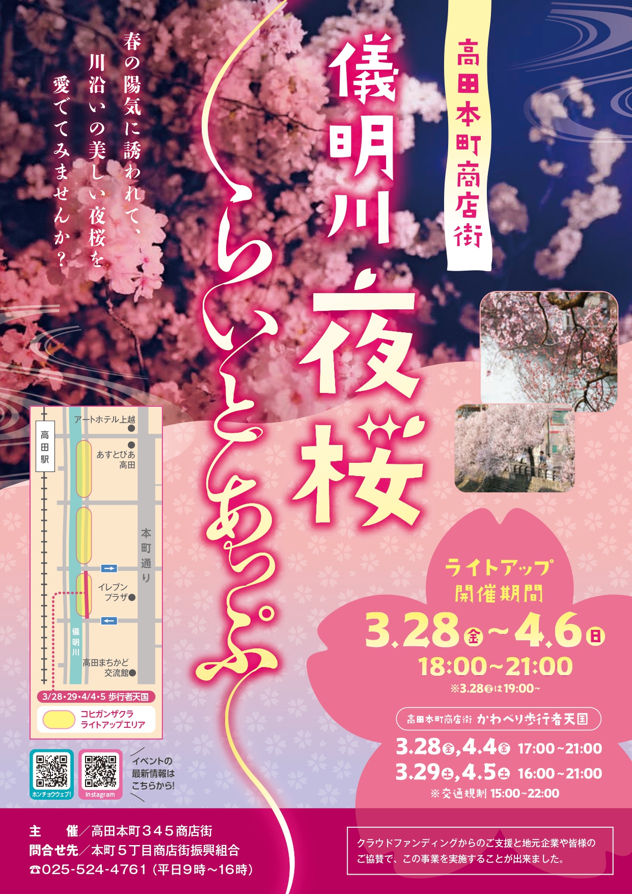 商店街では「第100回高田城址公園観桜会」に合わせて儀明川沿いをライトアップし、街全体を盛り上げようと、若手店主やスタッフらが企画した。年明けからクラウドファンディング(CF)を行い、目標150万円に対し、98人から169万9000円が集まった。