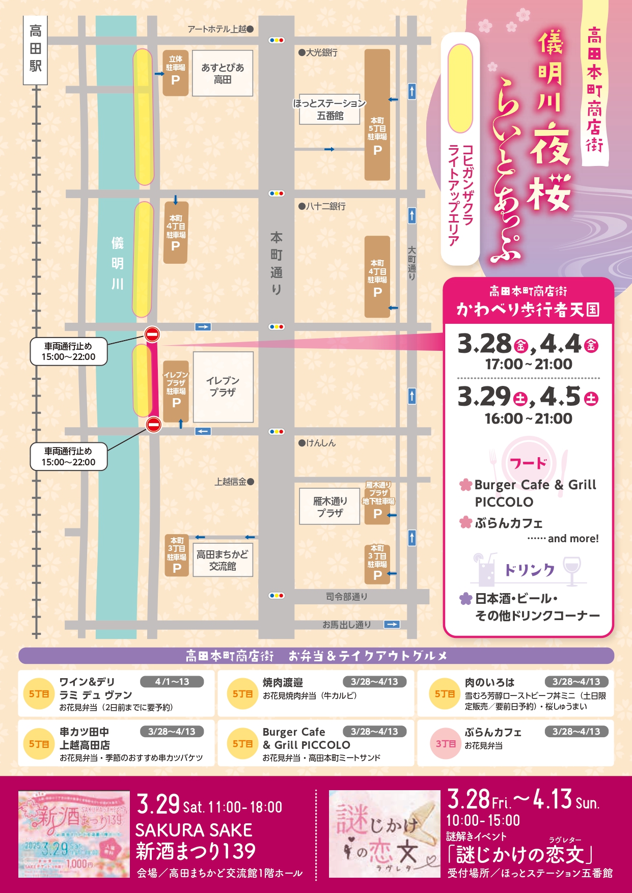 新潟県上越市の高田本町商店街西側を流れる儀明川沿いに咲く「コヒガンザクラ」のライトアップが2025年3月28日から始まった。初日は点灯式が行われ、雨が降り注ぐあいにくの天候の中、ライトアップの瞬間を見守ろうと多くの人たちが集まった。期間中の金、土曜はイレブンプラザ裏の道路が歩行者天国となり、フードやドリンクなどの店も並ぶ。