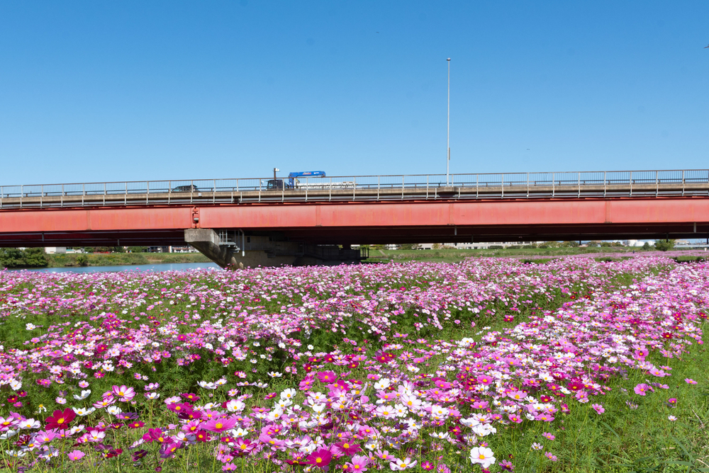 コスモスは1998年に糸魚川市のNPO法人徳合ふるさとの会代表の塚越秋三さん(71)が、河川敷対岸にある新潟労災病院の入院患者を元気づけようと植えたのが始まり。現在では河川敷を管轄する国交省高田河川国道事務所や県、市なども協力し、同NPOが事務局の「リバーサイド夢物語」が環境整備や花の管理を行っている。地域活性化の取り組みとして広がり、今年は上越地域の企業、団体から種の購入費やトラクターの寄付もあった。