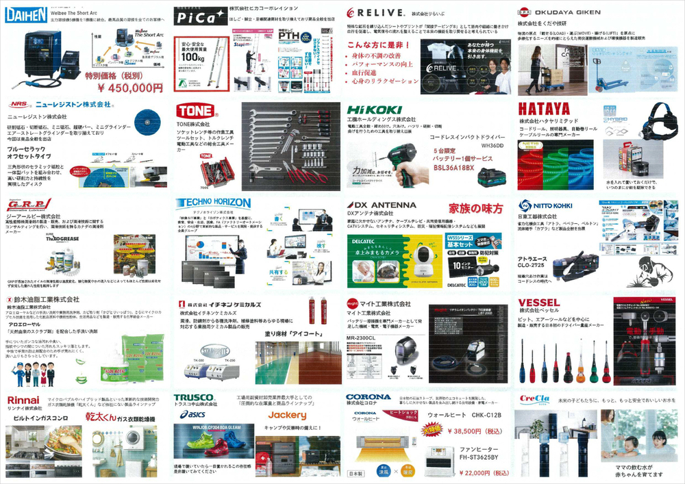 年に一度の大感謝祭は今回で4回目。お得に購入できるとして毎回好評を集めている。当日はメーカー各社が協賛し、溶接器具や工具のほか、住宅設備機器、健康器具、エアコンやコンロ、給湯器、空気清浄機といった家電などを展示・販売。主には法人向けだが、個人客の来場も歓迎している。