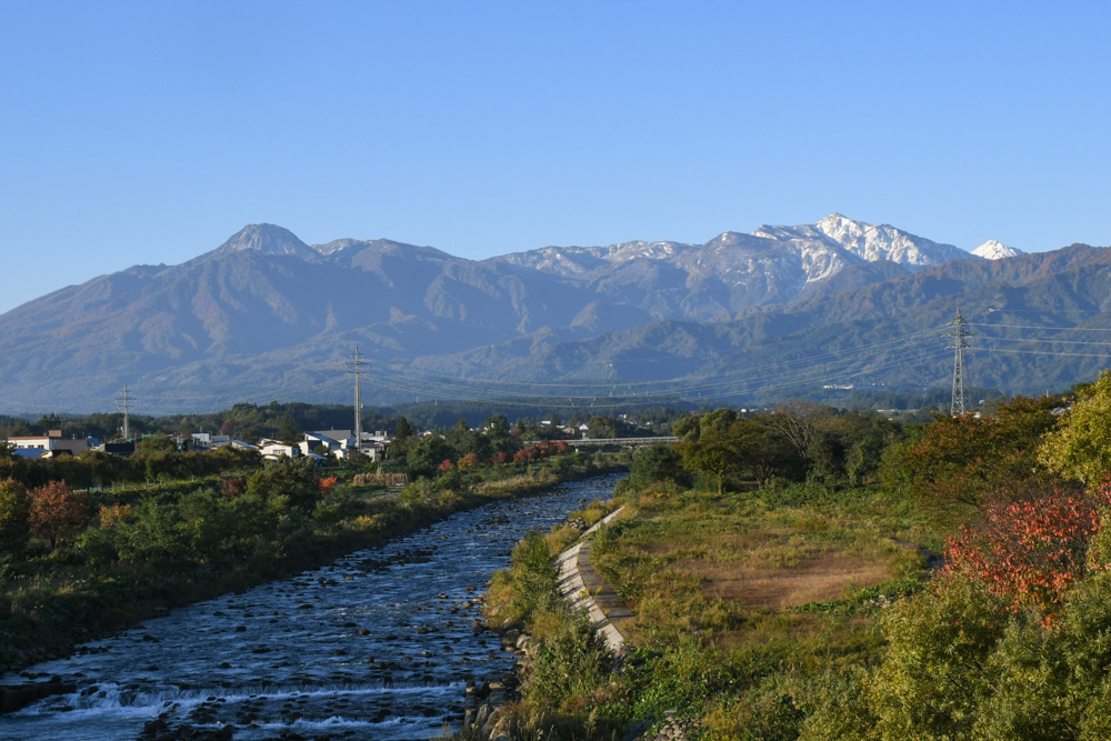 妙高市五日市のはねうま大橋からは、山頂付近が白くなっている妙高山、火打山、焼山の妙高連峰が望めた。