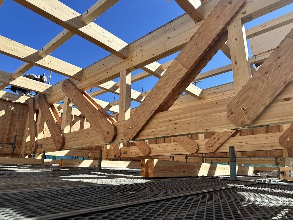 新潟県上越地域を中心に住宅建築などを手掛けるカネタ建設(本社・糸魚川市)はこのほど、倉庫、店舗、事務所などの事業用施設の新築時に利用できる木造建築システムを導入した。鉄骨造に比べ低コストなのが特徴で、2025年11月6〜8日には上越市頸城区の建築現場で構造視察&説明会を開催する。倉庫や店舗、事務所などの建設を検討している企業・個人事業主など誰でも自由に参加できる。
