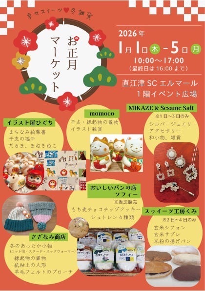 - お正月マーケット エルマール 〜5日 10時〜17時(最終日は16時) *雑貨やパンの販売 ちらし