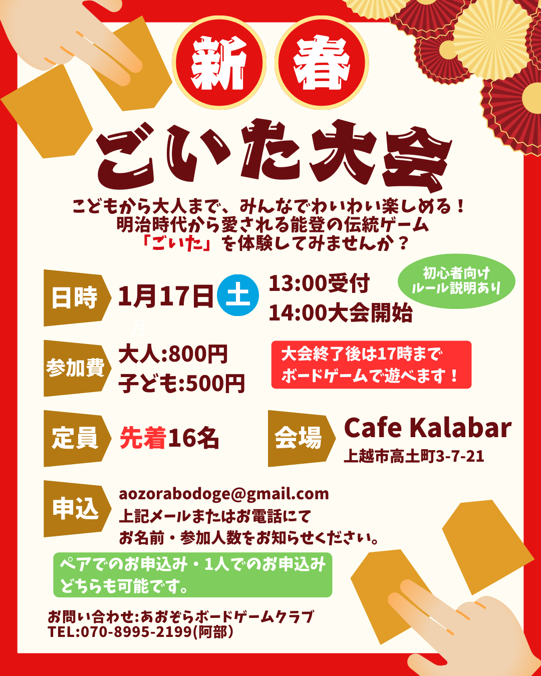 - 新春ごいた大会 Cafe Kalabar 13時~16時 *能登の伝統ゲーム「ごいた」を体験 参加費:大人800円、子ども500円 定員:先着16人 ちらし