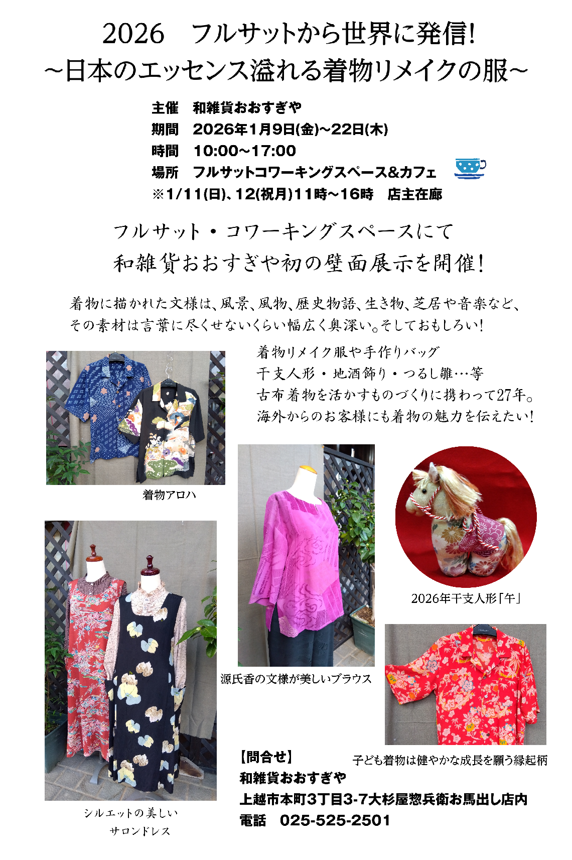 - 和雑貨おおすぎや「着物リメイクの服展」 フルサット 〜1月22日 10時〜17時 *着物リメイクの服や手作りバッグ、えと人形など ちらし