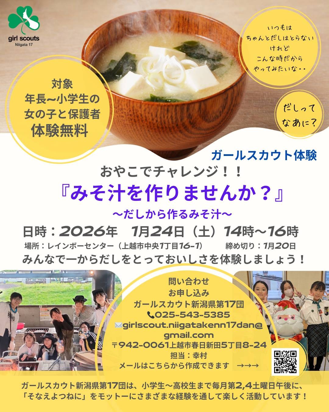 - ガールスカウト体験会おやこでチャレンジ「おみそ汁をつくりませんか?」 レインボーセンター(中央1) 14時〜16時 対象:年長から小学生の女子とその保護者 参加費:無料 申し込み:ガールスカウト新潟県第17団025-543-5385 ちらし