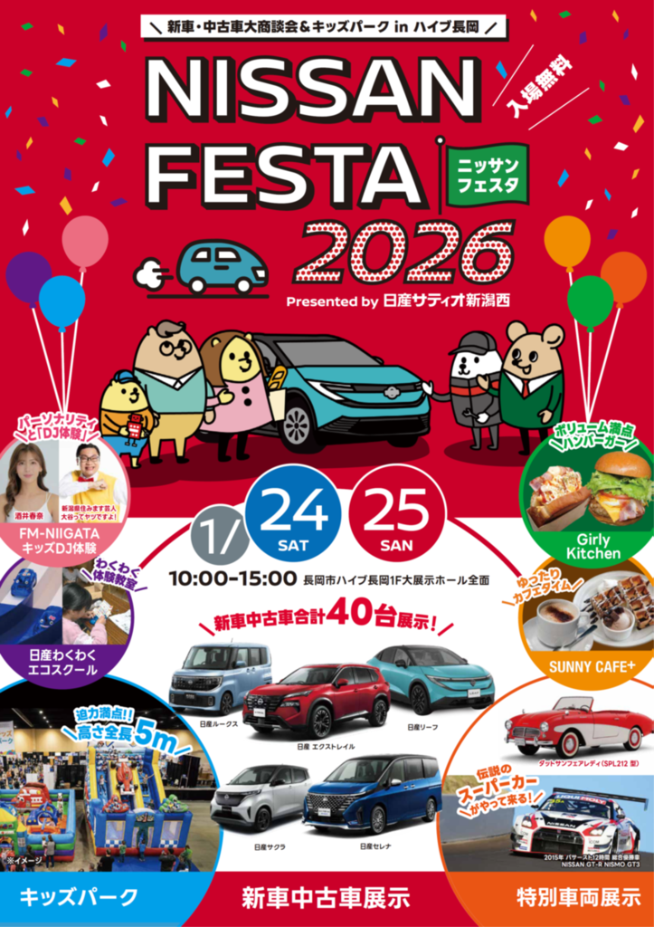 新潟県内に店舗を展開する日産サティオ新潟西は、2026年1月24、25日の2日間、長岡市のハイブ長岡でカーイベント「NISSAN FESTA 2026」を開催する。進学や就職、車検の時期を迎え、車の購入や買い替えを検討する人を主な対象とし、同時に上越インター店でも関連イベントを行う。入場無料。
