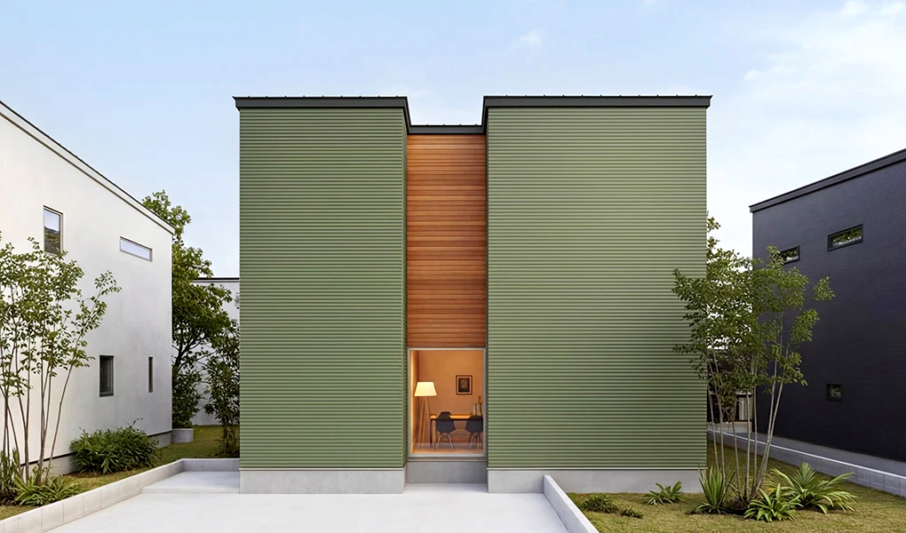 深みのあるグリーンの外壁に木目を添えた外観は、これから育てる庭の緑とも美しく調和するデザイン。太陽光パネルも搭載し、将来を見据えた仕様としている。