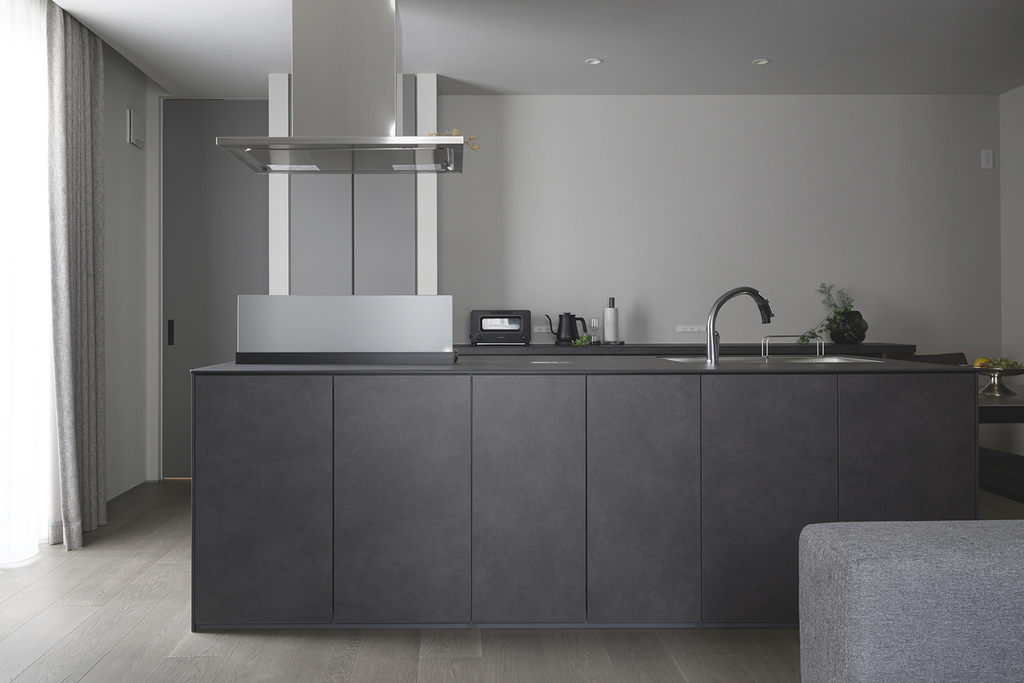 上越市土橋に完成したのは、上越初登場となる平屋のハイエンドモデル「ECOLOGIA FLAT」。グレーの塗り壁と大判タイルを組み合わせた重厚感ある外観に、天然石や無垢材を取り入れた上質な室内空間が広がる。