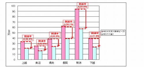 新潟県は2011年7月4日、県内地域別の消費電力の公表を始めた。県内を上越、魚沼、県央、長岡、新潟、下越の6地域に分けてホームページで公表している。 県は大規模な計画停電回避のため「ピークカット15%大作戦」を展開しており、これまでも県内全体の消費…