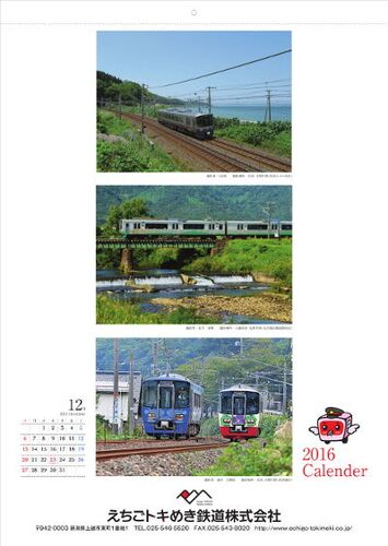 えちごトキめき鉄道(新潟県上越市)は、2016年のオリジナルカレンダーを販売している。今年3月に開業した同社のカレンダー販売は今回が初めて。車両や四季折々の沿線風景などの美しい写真が掲載されており、同社9駅の窓口などで販売している。1部500円。 壁…