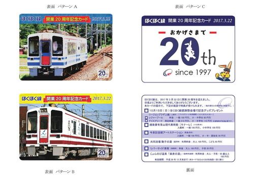 ほくほく線を運行する北越急行は2017年3月22日、開業20周年を迎える。開業記念日当日の22日(水)に、ほくほく線の車両内で乗客に開業20周年の限定記念カードを配る。 3種類のカードの絵柄とその裏面のデザイン カードの絵柄は全3種類。HK100形の車両をはじ…