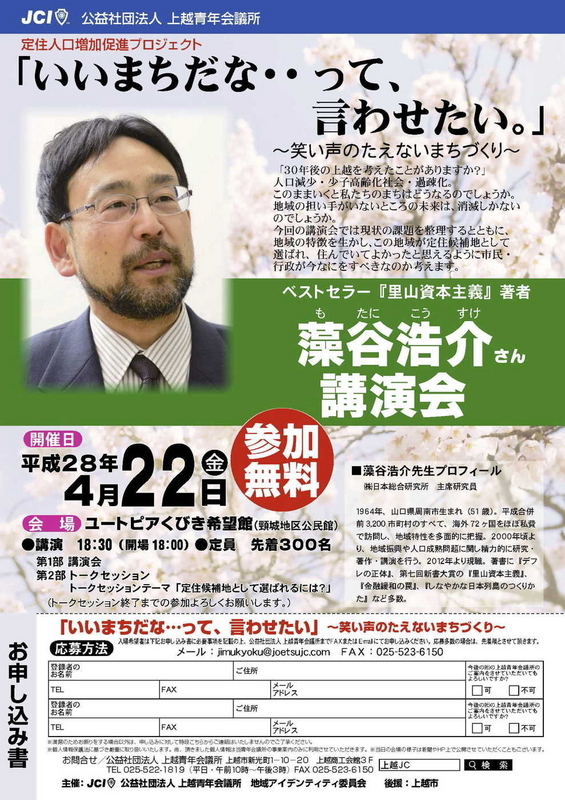 上越青年会議所はベストセラー本「里山資本主義」の著者、藻谷浩介さんを講師に招いた講演会を2016年4月22日、新潟県上越市頸城区のユートピアくびき希望館で開く。参加無料。