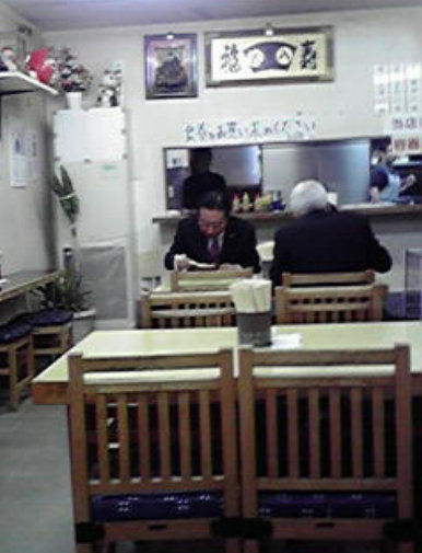 「天玉中か」を食べる野田首相(写真はその場に居合わせた市内の男性提供)