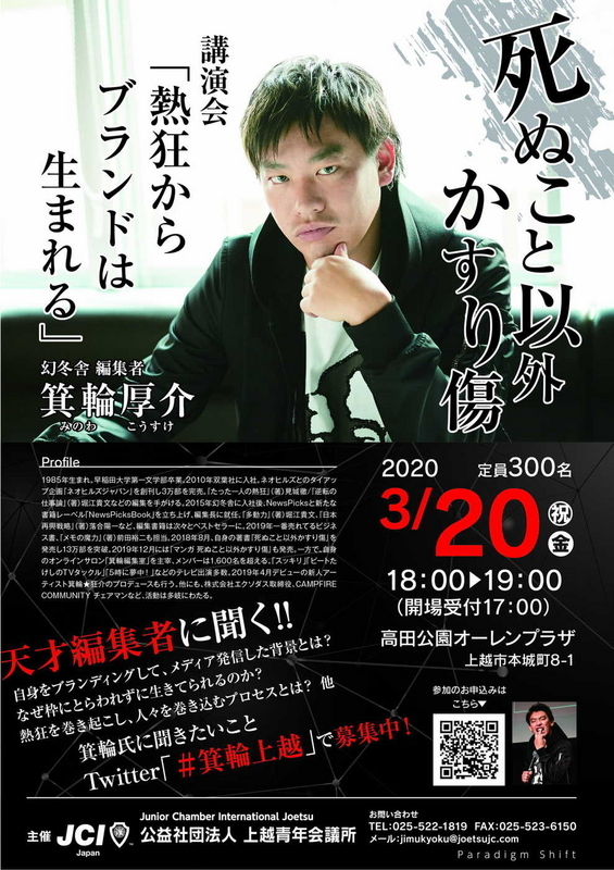 新型コロナウイルスの感染拡大を受け、新潟県上越市の上越青年会議所は2020年3月20日に開催する幻冬舎の編集者、箕輪厚介さんの講演会を同市本町6の高田世界館で無観客で行い、YouTubeでライブ配信する。時間は午後6時から同7時まで。誰でも無料で視聴可能。