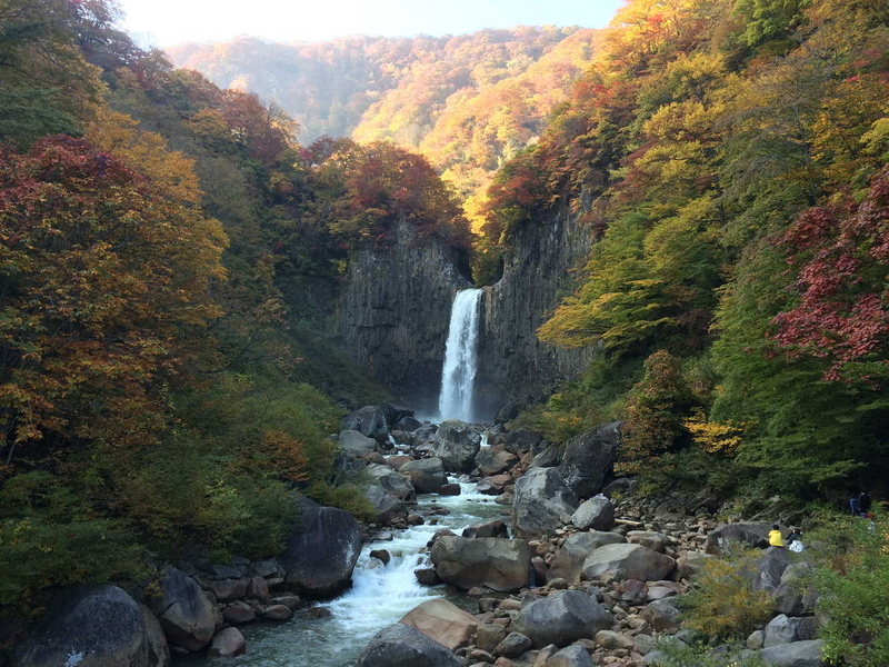 苗名滝は長野県との県境にある落差55mの滝で「日本の滝百選」に選ばれている。紅葉の見頃を迎えており、連日多くの観光客が訪れている。