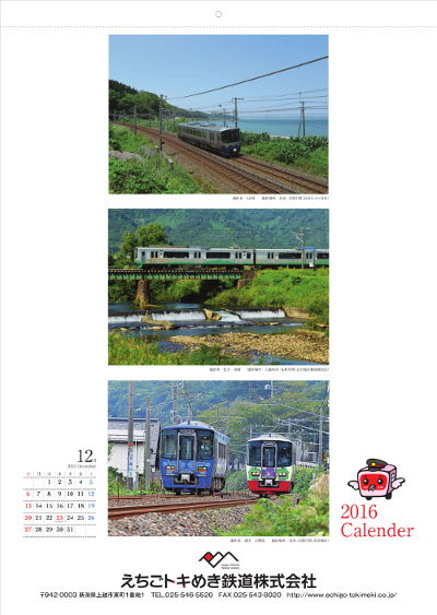 えちごトキめき鉄道(新潟県上越市)は、2016年のオリジナルカレンダーを販売している。今年3月に開業した同社のカレンダー販売は今回が初めて。車両や四季折々の沿線風景などの美しい写真が掲載されており、同社9駅の窓口などで販売している。1部500円。