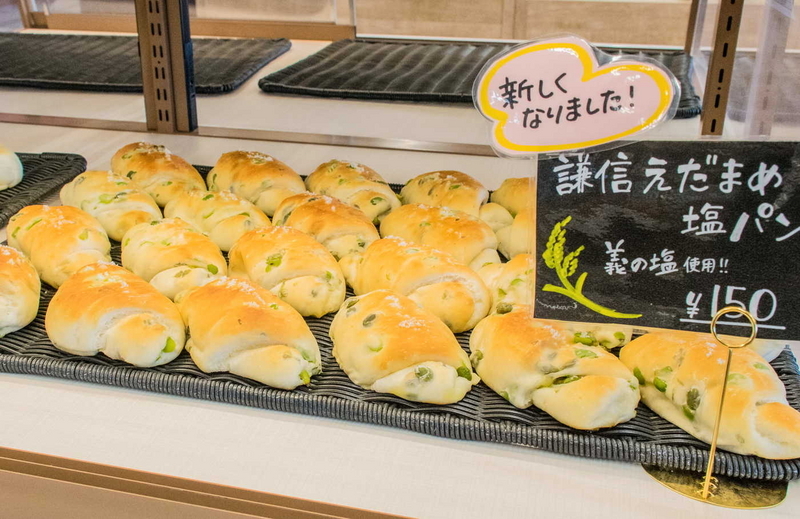JAえちご上越が運営する地場産食材の加工品などの直売施設「あるるんの杜」(新潟県上越市大道福田)では、米粉パンの新商品「謙信えだまめ塩パン」が人気を博している。上越野菜の枝豆と、上杉謙信に縁のある同市谷浜産の「義の塩」を使用。1日60個限定で、完売となる日も多い人気商品だ。