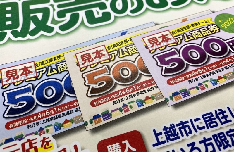 2022年6月1日〜11月30日に使える「上越食品衛生協会高田支部(飲食チーム&専門チーム)・直江津支部合同チームプレミアム商品券」の利用も可。