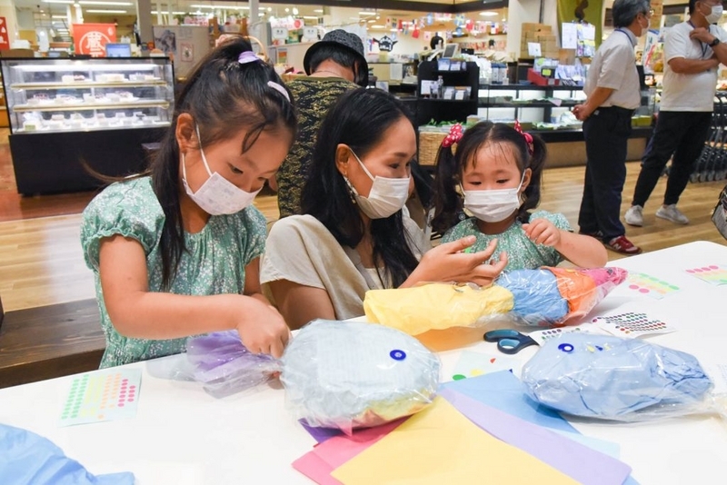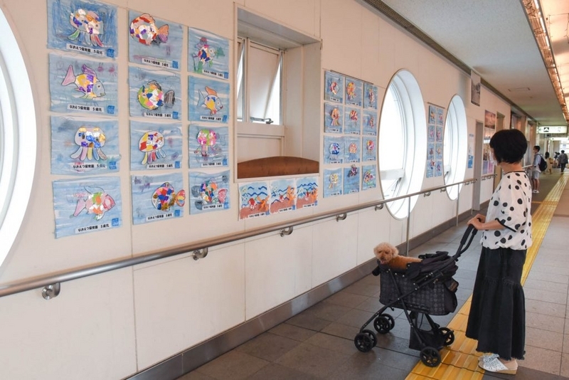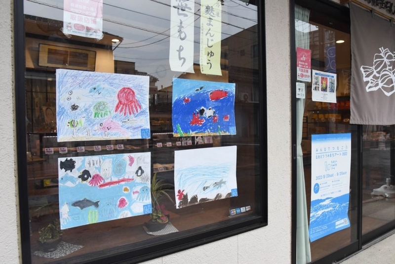 9月25日までの会期中、「うみまち水族館」と題し、直江津駅の自由通路や直江津商店街の店先などに市内の保育園、幼稚園の園児や小学校児童による魚やクラゲなど海の生き物を描いた作品約750点が飾られ、まちを彩る。手形や足形で表現したカニ、ペンギンなどもありユニークだ。