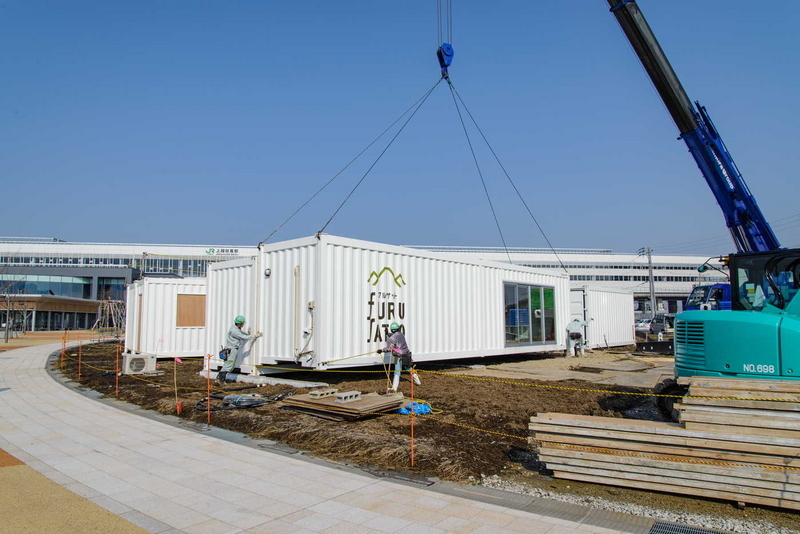 この日は、40フィートコンテナ3つと20フィートコンテナ2つが運び込まれ、40フィートコンテナを2つつなげた約60平方mの店舗2棟、20フィートコンテナの店舗とトイレ棟が設置された。4月上旬に第1期として、シェアオフィスのほか、通常はカフェとして営業して貸し切りでも使えるレンタルキッチンなどがオープンする。